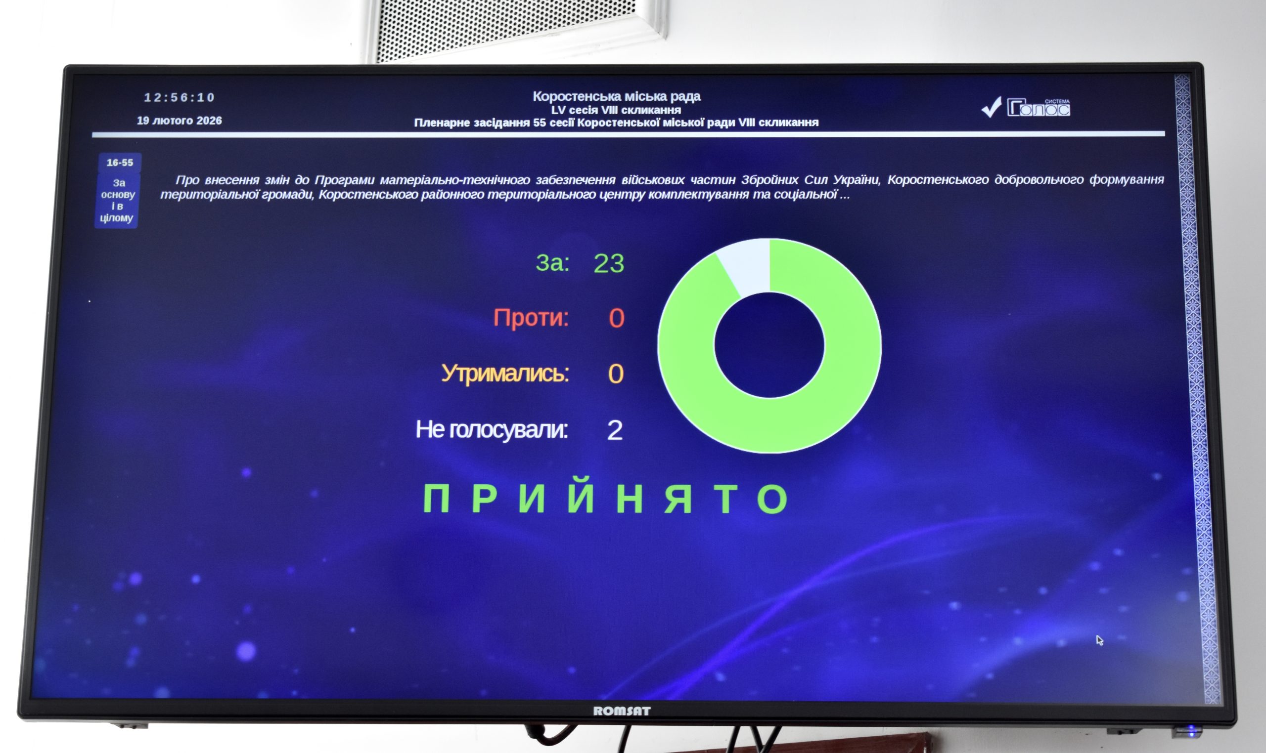 19 лютого відбулося пленарне засідання п’ятдесят п’ятої сесії Коростенської міської ради VIII скликання. Відповідно до затвердженого порядку денного депутати опрацювали та ухвалили 56 питань.