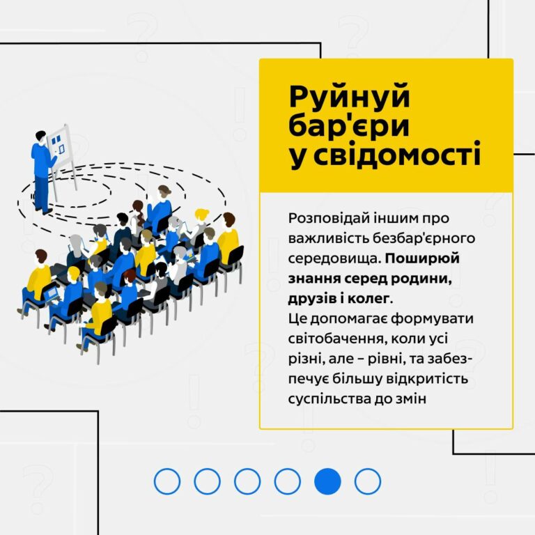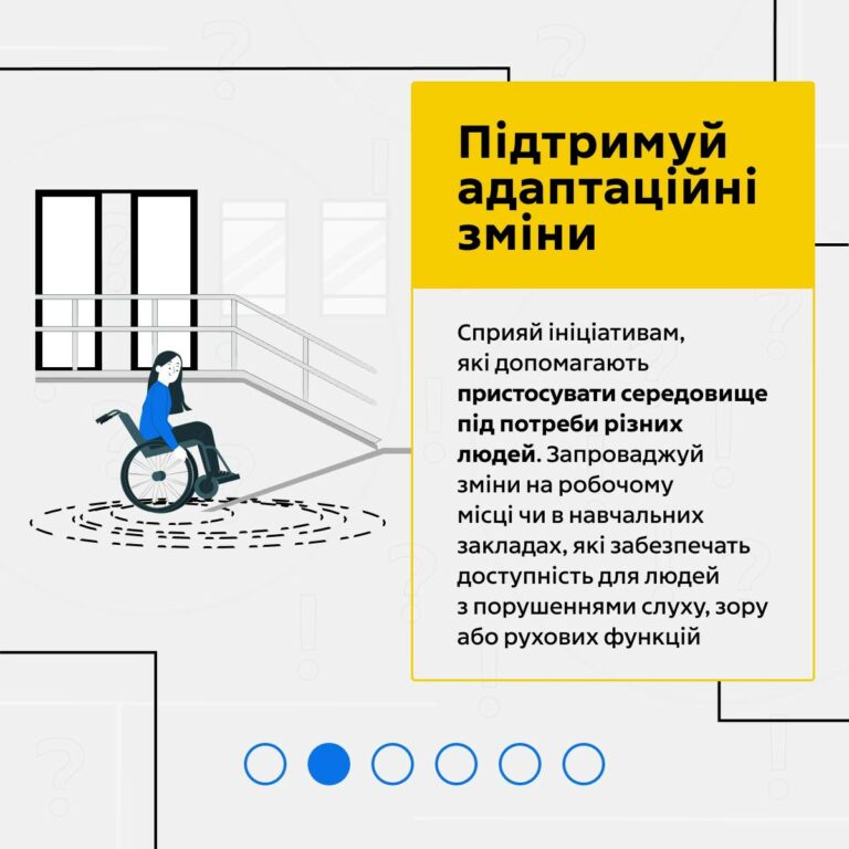 Підтримуй ініціативи, враховуй потреби інших, розповідай про безбар’єрність і будь прикладом у повсякденному житті. Разом ми формуємо суспільство, де різні можливості – не бар’єр, а сила.
