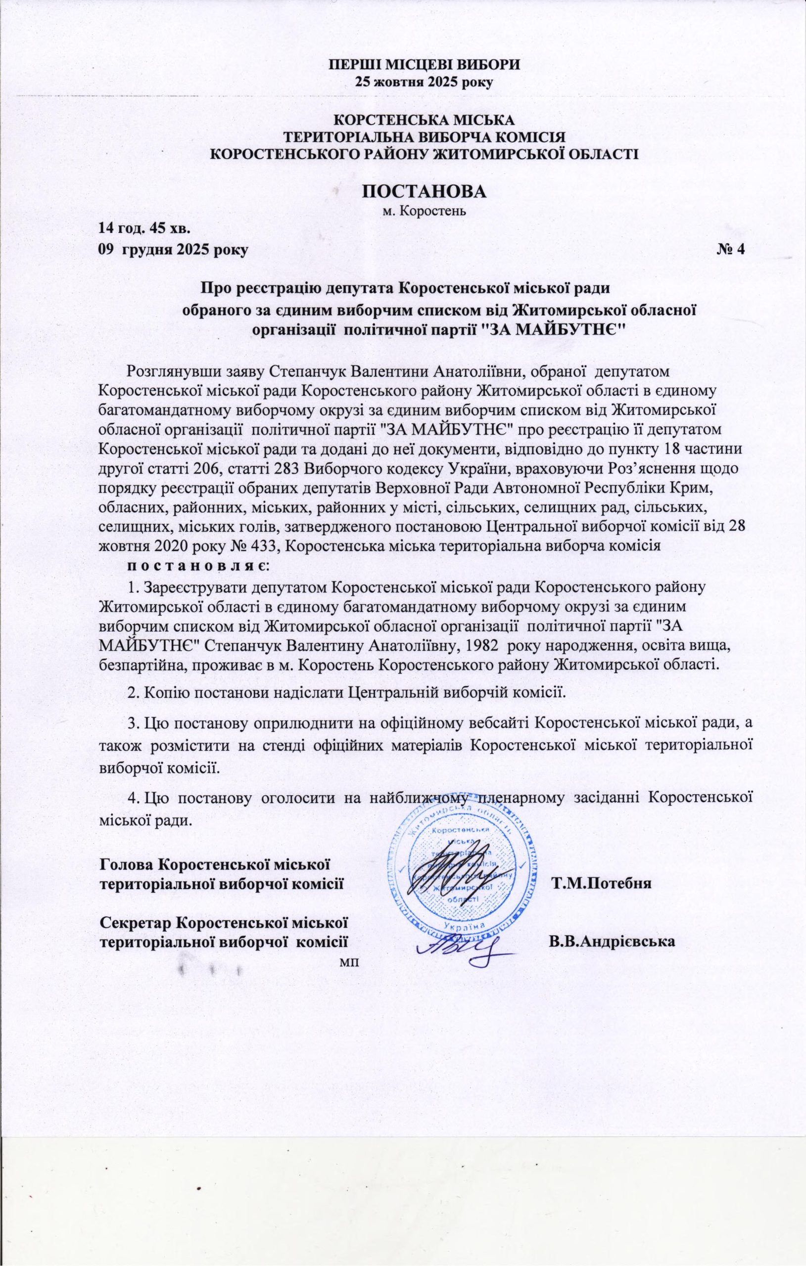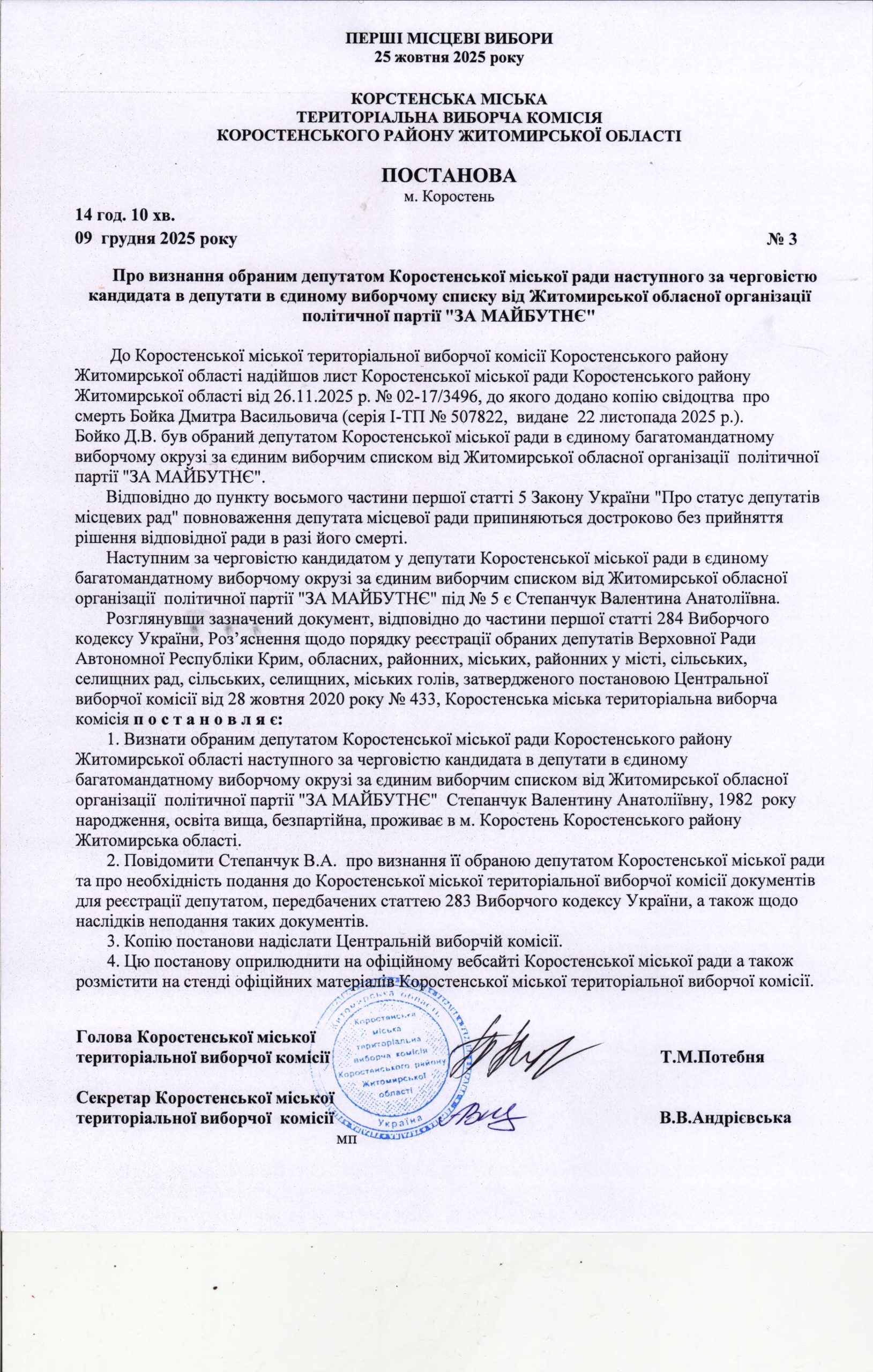 Про визнання обраним депутатом Коростенської міської ради наступного за черговістю кандидата в депутати в єдиному виборчому списку від Житомирської обласної організації політичної партії “ЗА МАЙБУТНЄ”