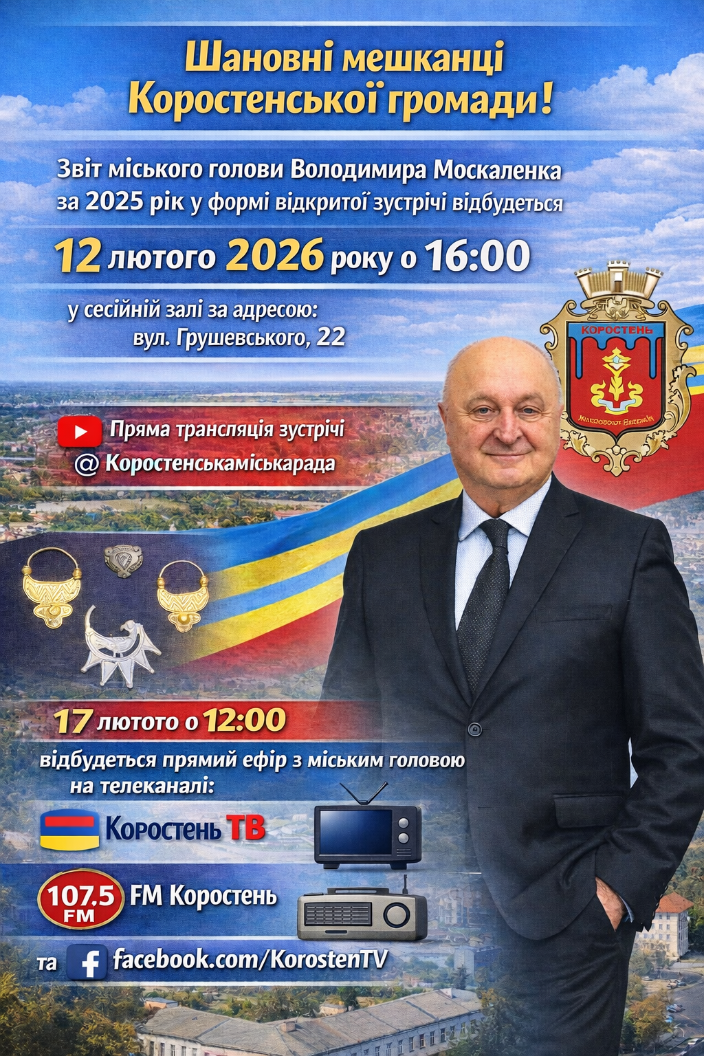 Звіт міського голови Володимира Москаленка за 2025 рік у формі відкритої зустрічі відбудеться 12 лютого 2026 року о 16.00 у сесійній залі за адресою: вул. Грушевського,22.